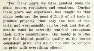 Early piano tool and supply catalogs published in the late 19th century were intended as much for the piano maker as the itinerant piano tuner, if not more so. The piano industry was growing and dynamic at this time, and piano makers could be found in cities all across the United States. A look at old city directories can confirm this.