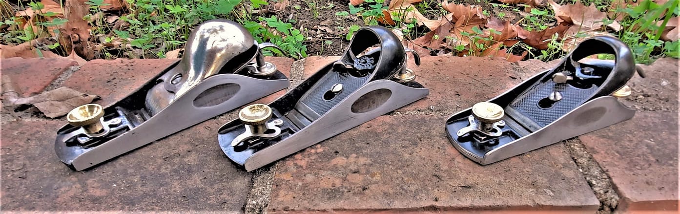 Stanley Bailey block planes, Nos. 19, 15, and 9 1/2, all made in 1898 with Excelsior body and handy-hold cheeks.