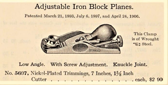 “This Clamp is of Wrought Steel,” proclaimed the Sargent Co. in the 1926 introduction of their 5607 Low Angle Block Plane, 7″ long, with 1 5/8″ cutter. This was an oblique reference to the fact that their first cast iron knuckle type cap, recorded in A.A. Page’s patent of 6 July, 1897, would crack if you looked at it funny!