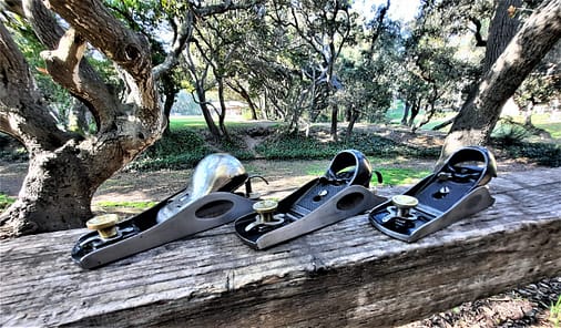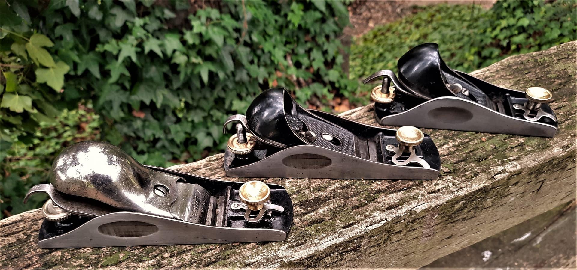 Stanley Bailey block planes, Nos. 19, 15, and 9 1/2, all made in 1898 with Excelsior body and handy-hold cheeks.