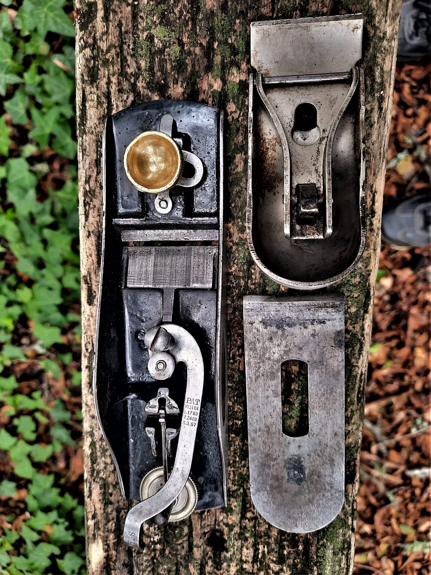 Interior of Stanley Excelsior No. 19, showing leveral lever with 4 patents, eccentric lever for mouth adjustment, patent 1894, and “J” logo iron (1874-1909).