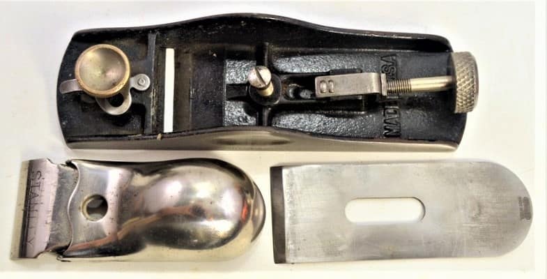 Millers Falls No. 47 Low Angle Block Plane, in it’s original guise. Photo from Worthpoint.com. When one compares the M-F 47 to the Stanley 65, they are very similar, however, when placed side by side, small differences appear in the details and contours. The most noticeable differences would be that the M-F 47 has a thinner casting than the Stanley 65 from the same era. The knuckle-joint lever cap is a 3 piece design rather than a 4 piece design in the Stanley knuckle joint lever cap, after its 1913 redesign. Utilizing the back of the knuckle joint would seem to be a more secure method of bolstering the locking action into place, but it is actually not quite as stable as the Stanley, in my opinion.