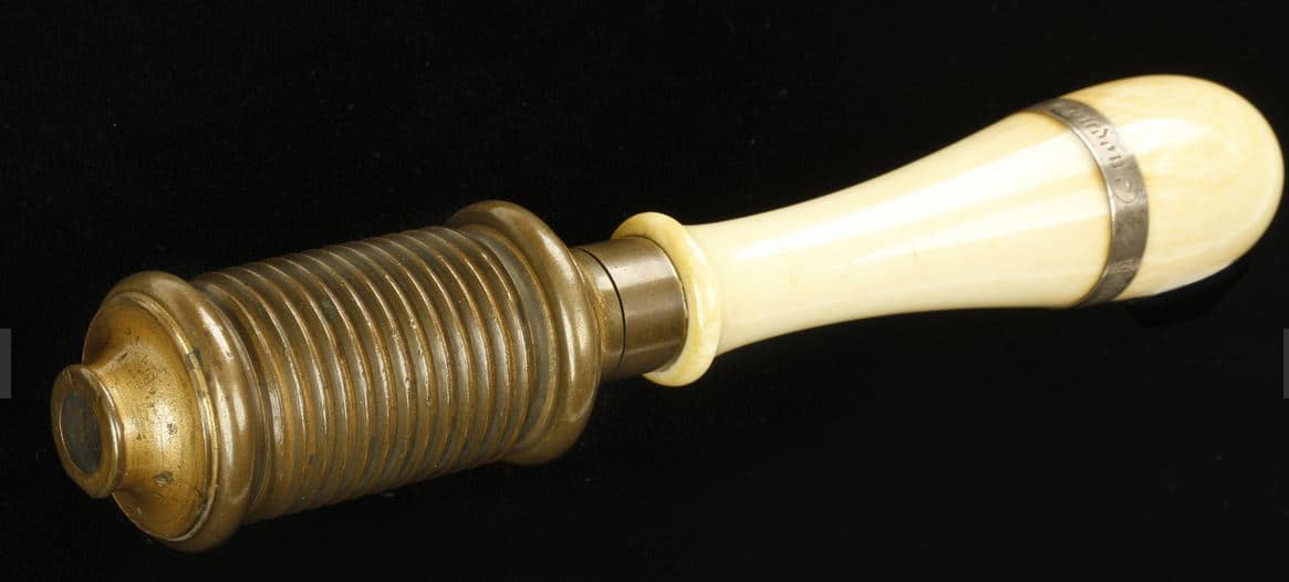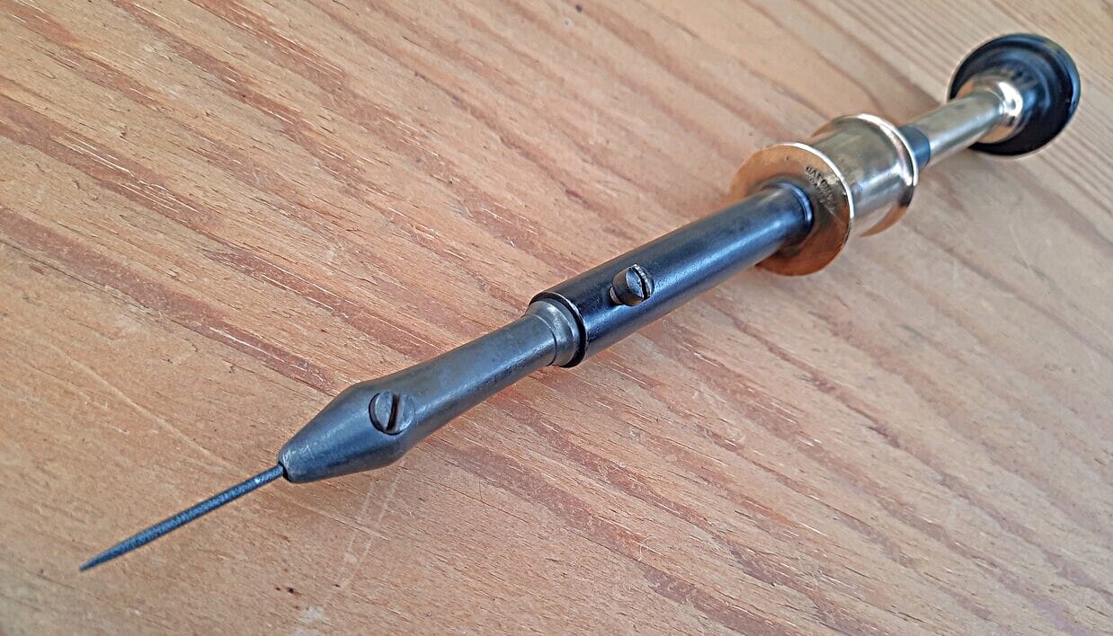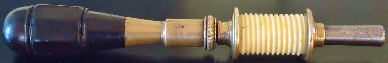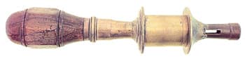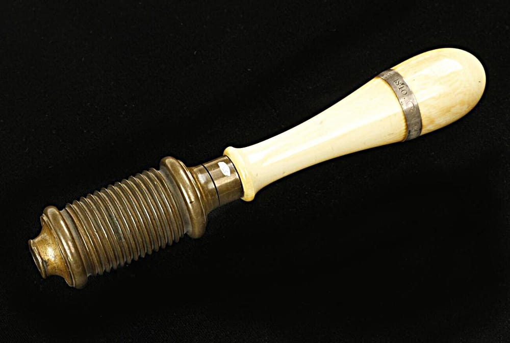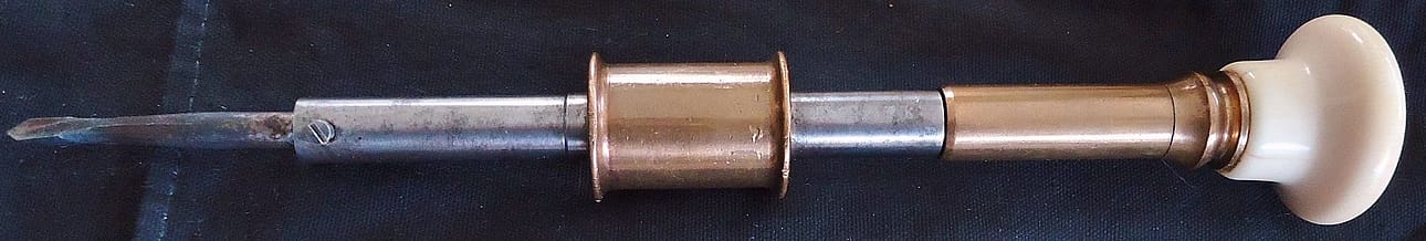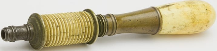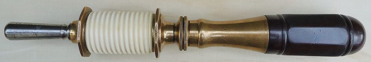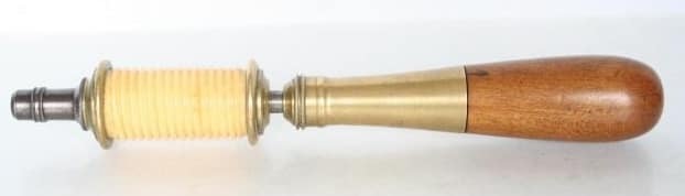 N. Erlandsen bow drill partially disassembled. An adjustment screw at the back of the ferrule adjusts the amount of play/friction for the rotation of the spindle. Ivory spindles would tend to crack under the stress of constantly reversing direction while driven by the bowstring. Several methods were employed to fix these spindles to the steel center shaft: a tight pressure fitting, fixing with a pin drilled through the steel shaft and into the ivory, and threading both the shaft and the spindle. Louis Eicke patented the latter method, and an Erlandsen-type drill stock is depicted in his patent drawing. Eicke’s solution proved generally successful in avoiding split and cracked ivory spindles.