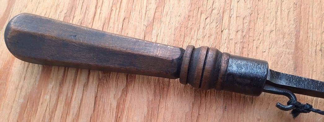 Not sure if this actually the Harwood type, or if it has “R. Fishley” or another maker written inside, as the wooden handle is frozen (for now) on the brass hardware. Bob Garay has a similar bow drill stock inscribed with “R. Fishley.”