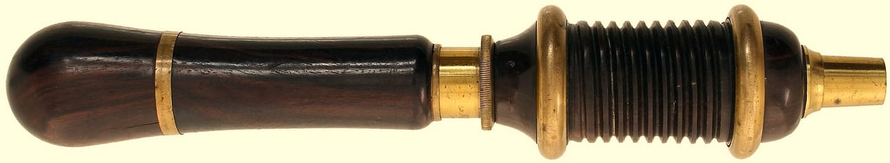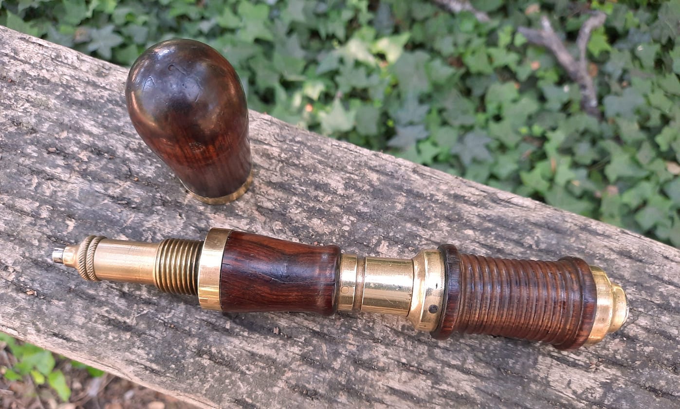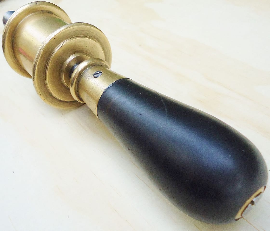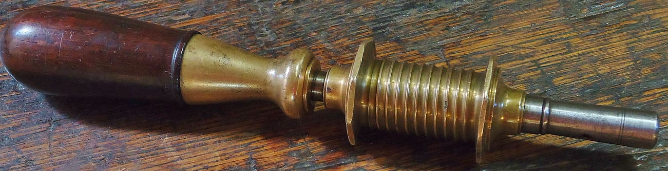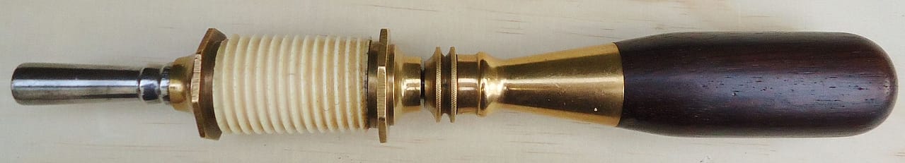Even the more basic piano drills show precision and elegance. Here is the rear view of the ebony handled drillstock, showing a steel friction adjustment screw bushed in brass. Mirrored from the brass spool with triple step, the handle ferrule shows the same detailing.