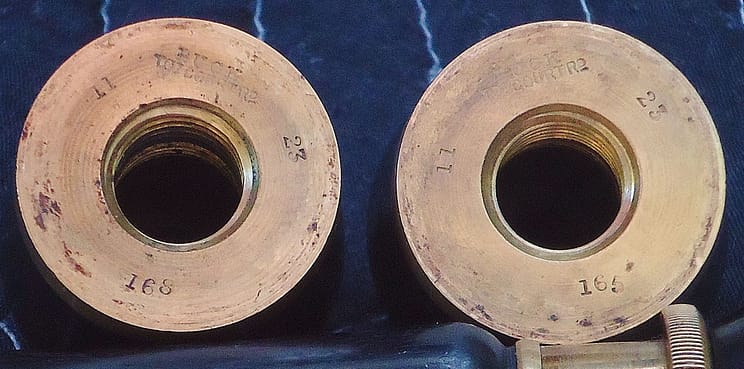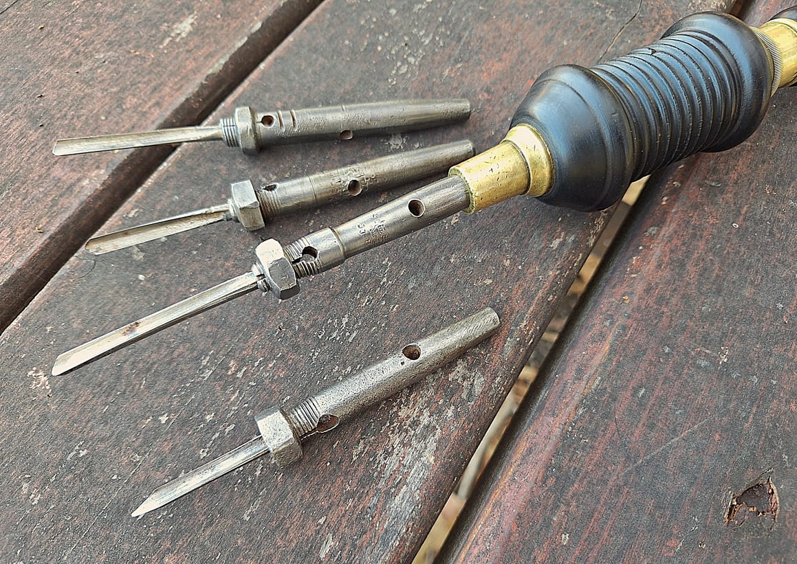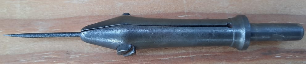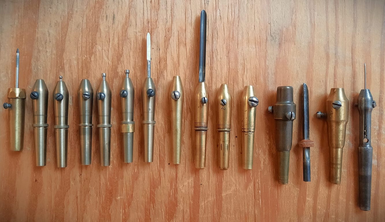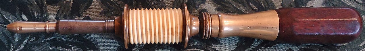 Buck piano bow drill stock, with 4 pads and spoon bits. The English piano bow drill pads generally worked on a taper, starting at a larger diameter than the New York drills, and usually retained the bits with a heavy two piece collet tightened with a are nut.