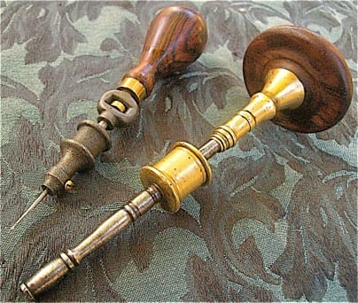 Diminutive drills; these are sizes that would have been used with the bows shown at the top of the photo above. Both of these drills have rosewood handles; the ornate drill on the right has a handle in the German style.