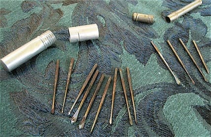 New bow drill,with bits for working in stone, called a “violin drill.”