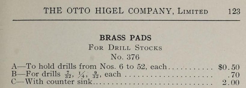 Pads for Bow Drill Stocks, bits for same, as well as for hand brace. Drill pads were friction fit into the tapered socket of the drill stock, and the bit was fixed into the socket of the pad by tightening the set screw, or screws. The bits included in the 1900 H. S. catalogue were mostly the spoon type, and the various sizes and their intended uses were covered over several pages. Specific applications described were for bridge pins, tuning pins, lyre rods, center key counterbores, countersinks, and general uses.