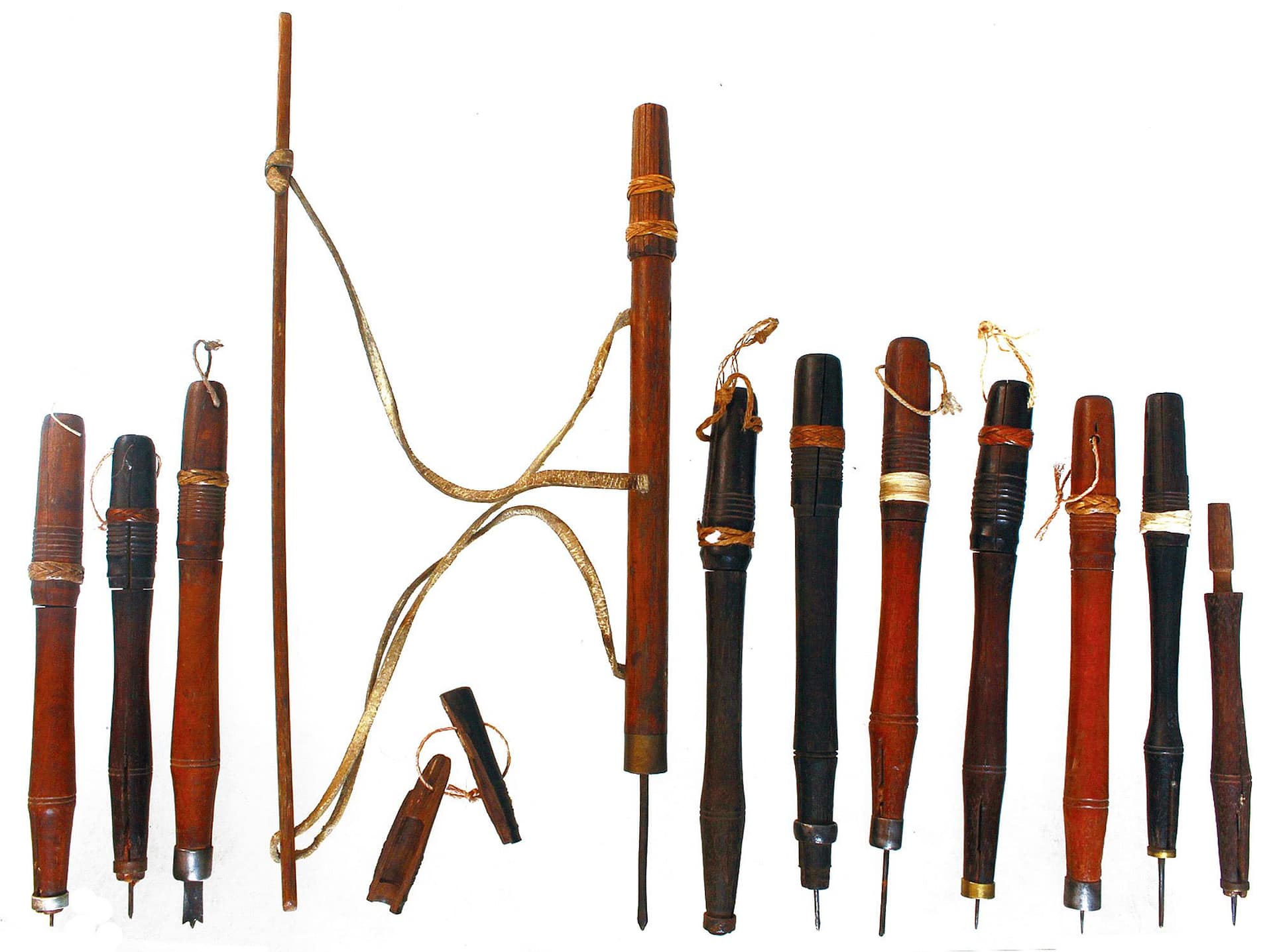 New bow drill,with bits for working in stone, called a “violin drill.”