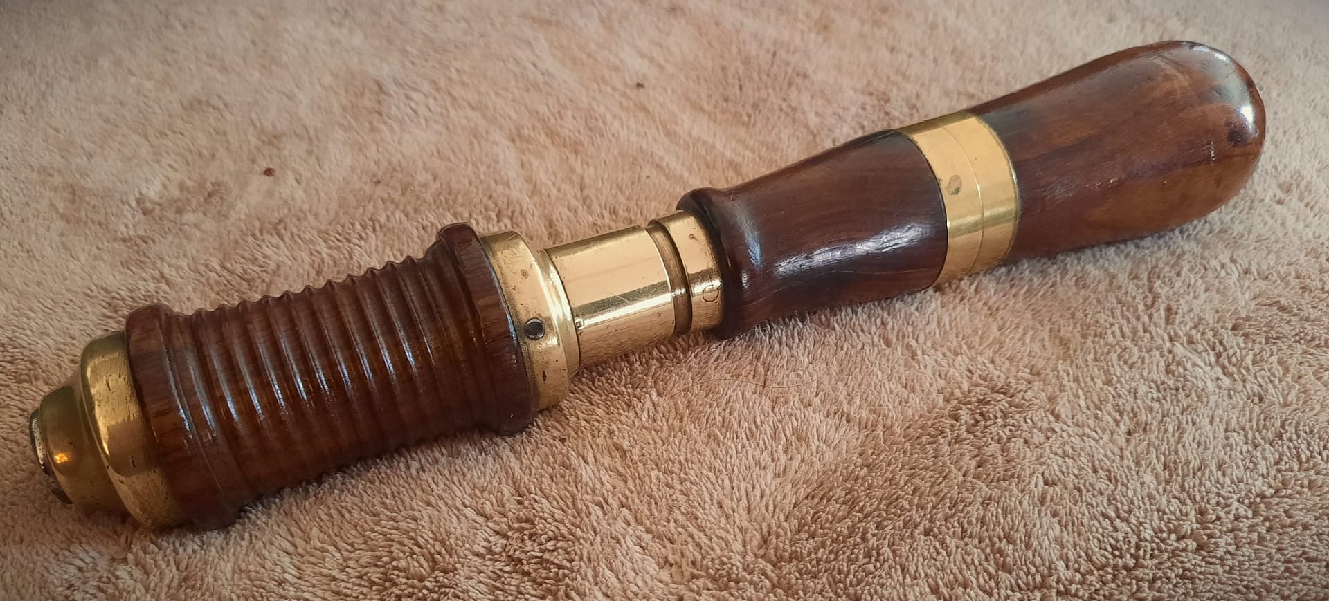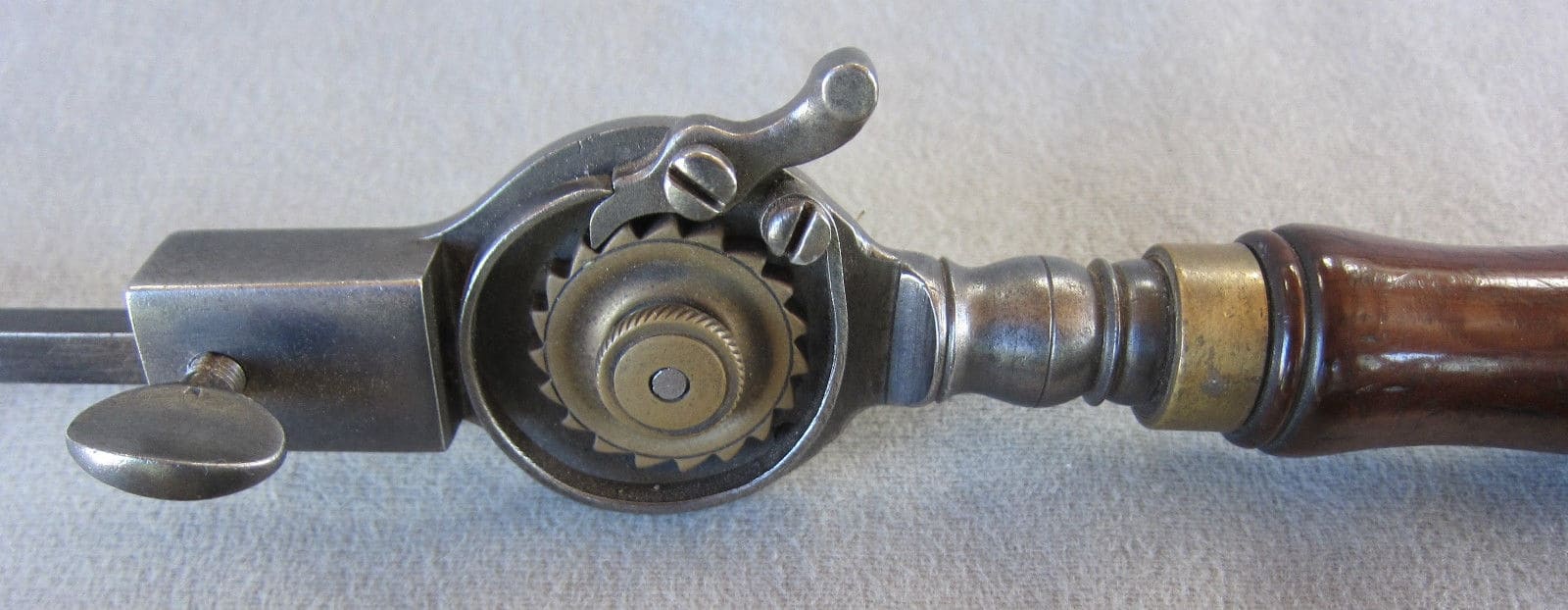 Even the more basic piano drills show precision and elegance. Here is the rear view of the ebony handled drillstock, showing a steel friction adjustment screw bushed in brass. Mirrored from the brass spool with triple step, the handle ferrule shows the same detailing.