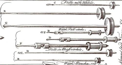 Bow drill stocks, illustrated by John Wyke. From “Catalogue of Tools for Watch and Clock Makers,” Liverpool, c. 1770s.