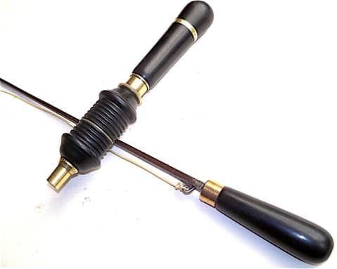 Buck Ebony bow drill set. The Solingen wrought steel was bent hot. George Buck trading from 245, 247, and 242 Tottenham Court Road, London, also sold specialized piano tools, such as regulating tools, as well as tools for other trades. In the photos above and below, the bow is not the original; I made this one with an African Blackwood handle, and a converted antique French fencing foil, with Solingen steel and gut string. The original bow featured a ratchet adjustment, which set the string tension between the bow ends and around looped pulley, to the appropriate amount of friction. Bob Garay has a website on bow drills, which includes a number of New York bow drills made for the piano trade, as well as a photo of the original Buck bow.