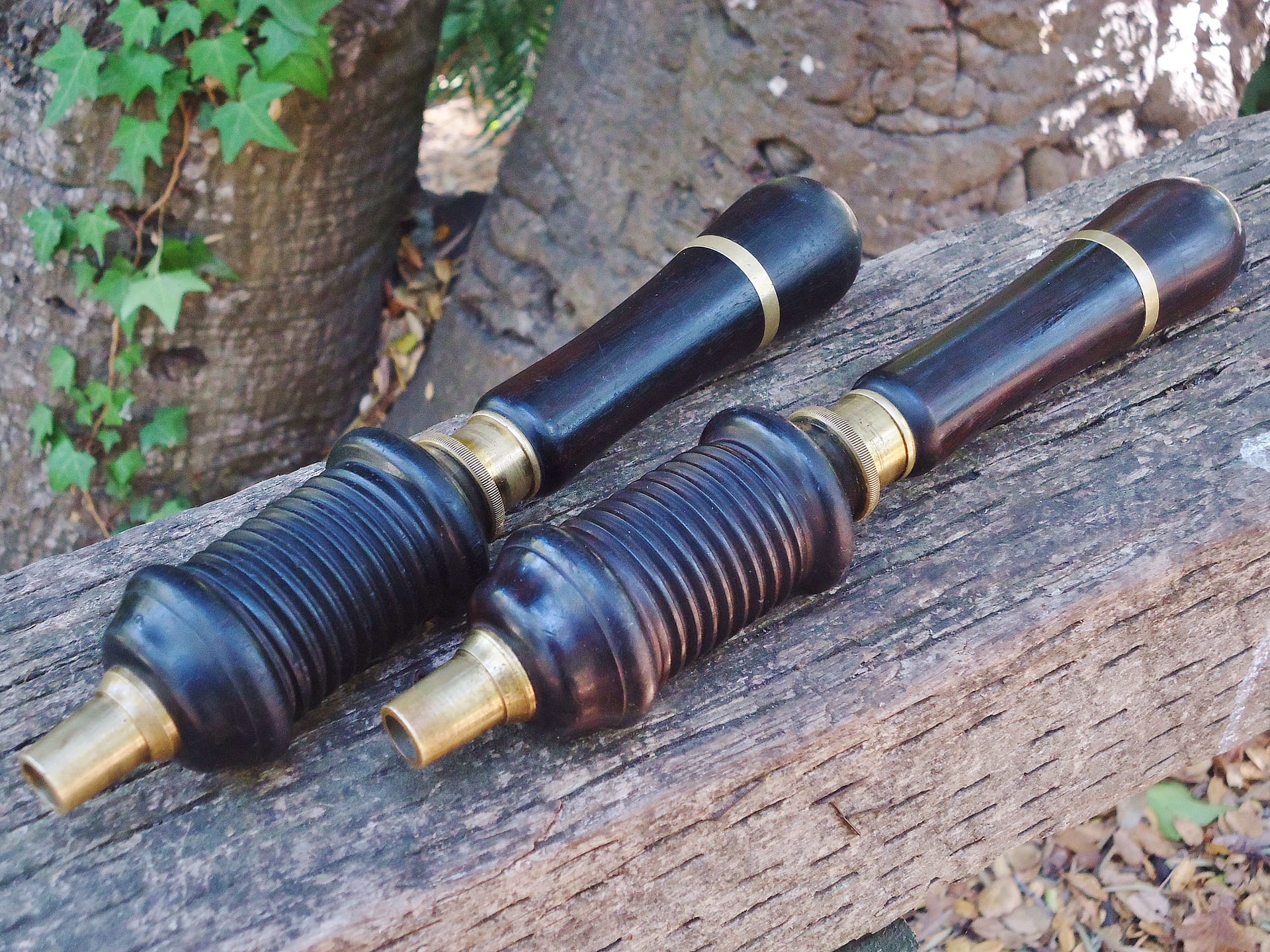 Two Buck bow drill stocks, found together, one is rosewood, and the other is dark rosewood with the spool possibly ebony. The rosewood drill is shorter and narrower than the darker one, but the shape of the handles suggest that they were made at the same time. Both Buck drills likely were used in the same factory shop floor.