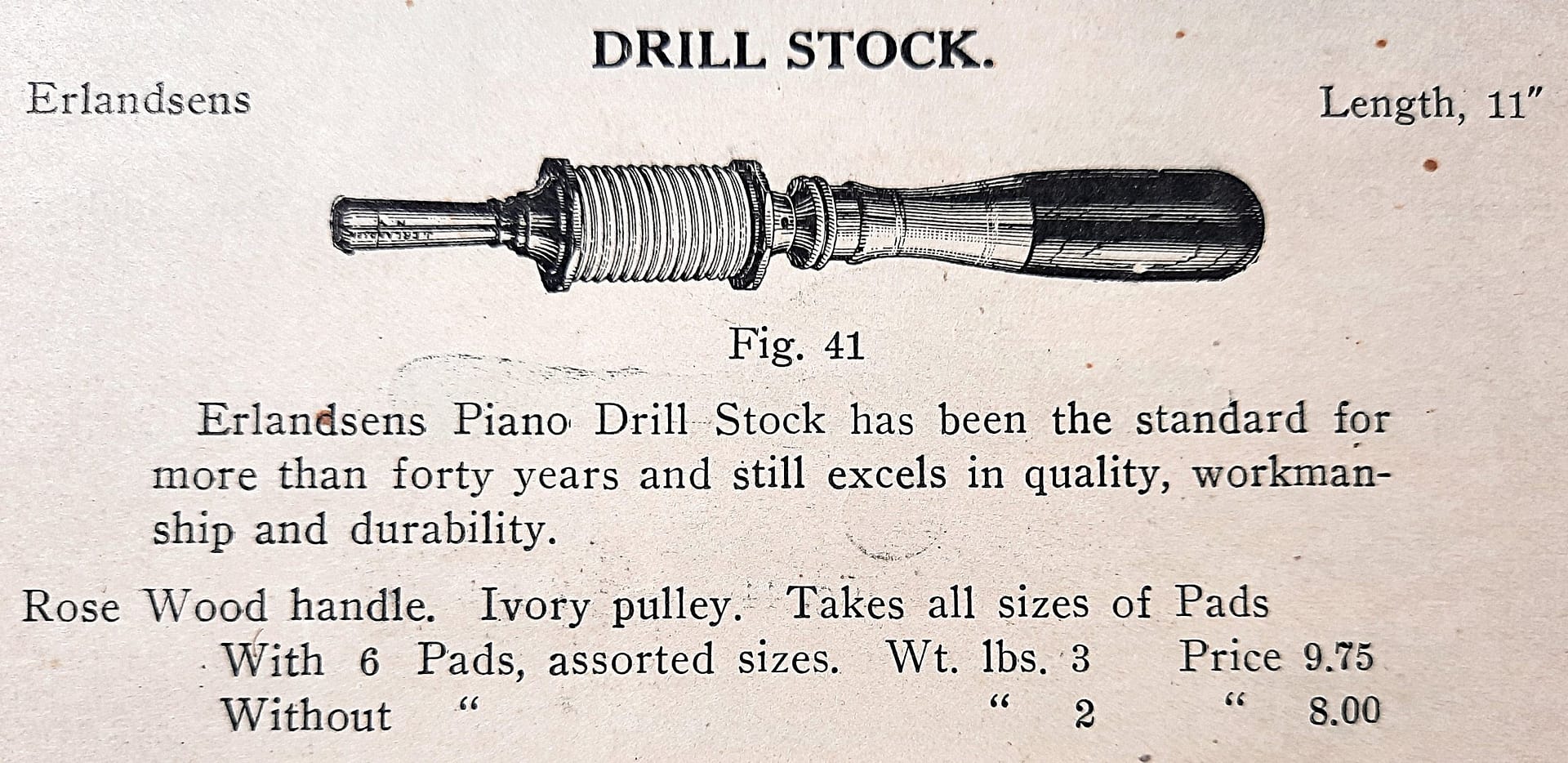 Julius Erlandsen’s Bow drill, as shown in the J. & J. Goddard 1938 Catalogue. The last catalogue entry showing the Erlandsen bow drill, or any piano maker’s bow drill for that matter, was in the J.& J. Goddard of London, no. 80 trade list, circa 1938–1939:
