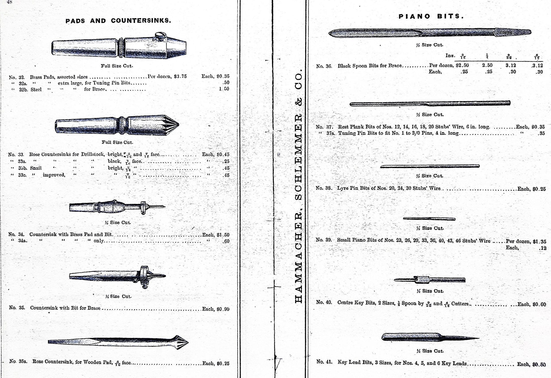 Pads for Bow Drill Stocks, bits for same, as well as for hand brace. Drill pads were friction fit into the tapered socket of the drill stock, and the bit was fixed into the socket of the pad by tightening the set screw, or screws. The bits included in the 1900 H. S. catalogue were mostly the spoon type, and the various sizes and their intended uses were covered over several pages. Specific applications described were for bridge pins, tuning pins, lyre rods, center key counterbores, countersinks, and general uses.