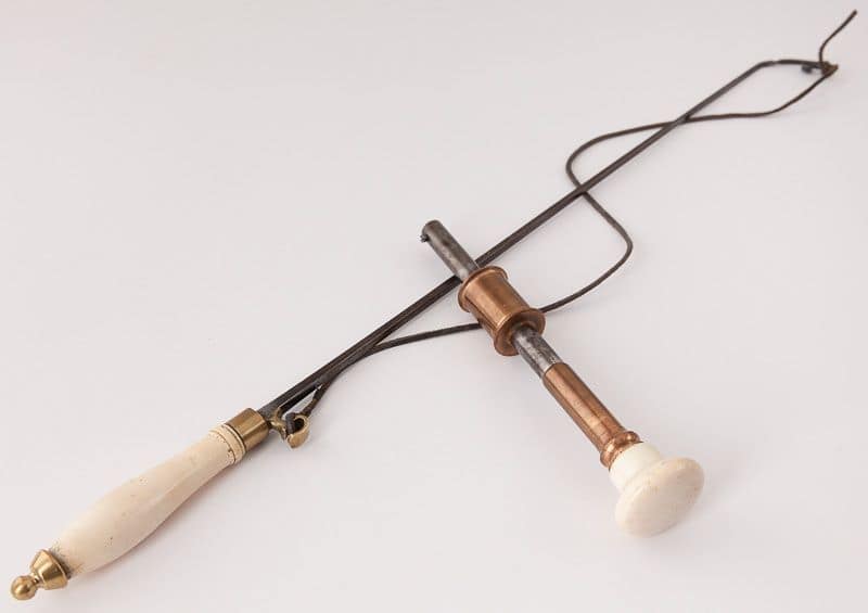 Various drill bows, with ratcheting string adjusters. (photo Skinner Auction Co.) Small bows shown at the top left were used by watchmakers and jewelers, and are also about the same size as those used by early dentists. They would be held by the hand in the middle of the bow, therefore, a handle was not necessary. Examples such as these would have been made of brass, whalebone, or steel. The four bows with handles are shorter and somewhat smaller than those typically used for piano work. Bows for the Erlandsen or the Buck drills usually range from two and a half to three feet, enabling the craftsperson to develop more speed and create more inertia. I imagine that it must have been a challenge to use these long bows inside the piano, while still managing to avoid striking the inside of the case.
