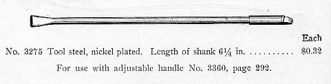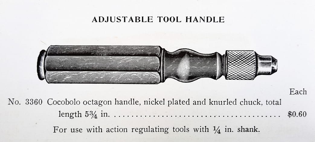 C.H. Lang, 1905: “All regulating tools to fit [handle] 20 cents extra, which is nothing compared to all the trouble with the wooden handles.” Lang also referred to the problem of splitting wooden handles, which happened often when the tang was inserted with too much force.
