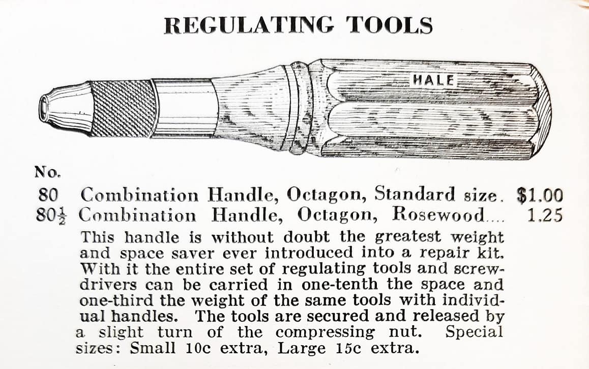 Hale combination handle 1938. Three sizes were offered, from the late 1920s, until c. 1942, which was a lot considering the rather spartan amount of tools offered in the Hale catalogs. Today, two sizes, at most, are available from any one supplier of combination regulating handles.