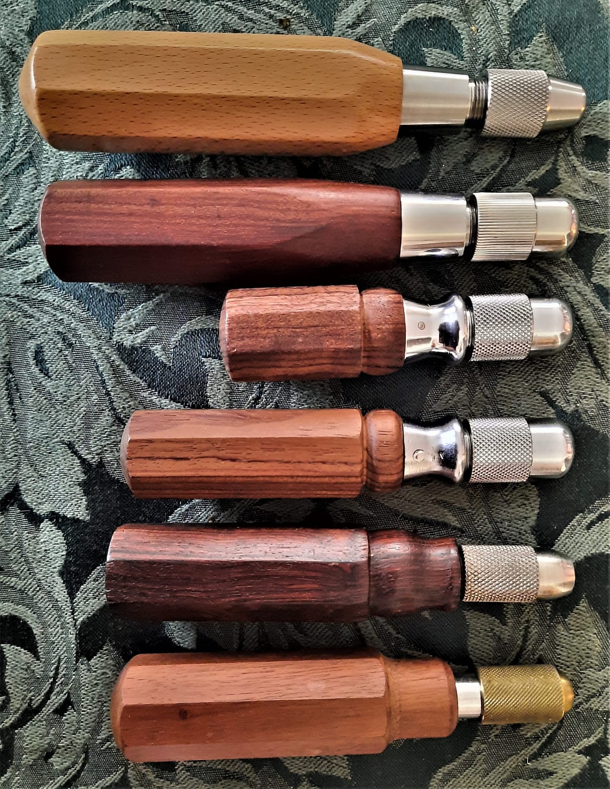 Original Hale “Friction Grip” handles, in mahogany, with No. 25 German Silver center pin as locking bar for the inserted tool. I purchased these new from Hale in the 1970s. The Hale drop regulator is 3 1/2″ long.