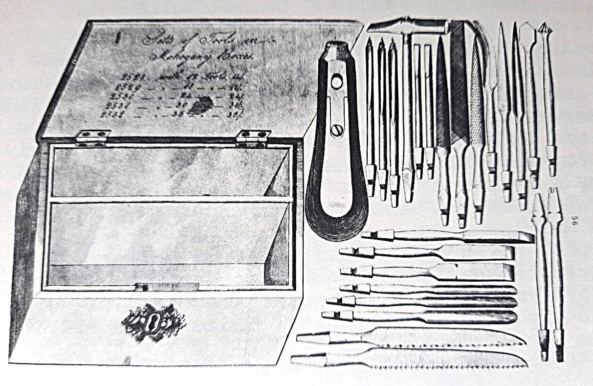 This Richard Timmons “Setts of Tools” included a wide range of interchangeable hand tools and Mahogany Box with ornate escutcheon. From a Birmingham trade list pattern catalogue, circa 1810.
