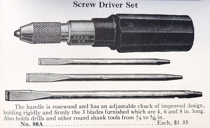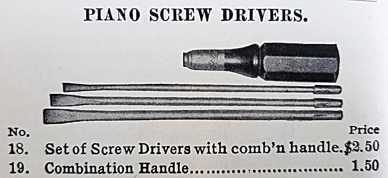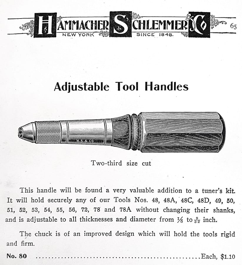 Adjustable handles for piano regulating tools became popular for the mobile piano technician relatively soon after their introduction around 1900. Since a good number of regulating tools were made to be compatible with it, including screwdriver blades with sizes up to 5/16″ for general driving, these handles were used constantly. In order to accommodate the different functions of all these tools, Frank Hale at Tuners Supply in Boston offered their combination handles in small, medium, and large sizes. As far as I know, there is no current supplier who offers three sizes, and Hale was not known for having a selection of tools as large as Hammacher Schlemmer or American Felt Co.