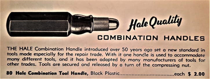 Hale Combination Handle; black plastic, and only available in standard size. From Hale Tuners Supply 1948 Catalogue.
