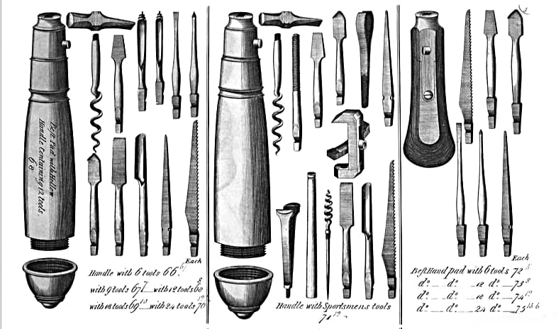 The Pad Handle was developed in the late 1700s in order to cater to the desires of an emerging class of wealthy British individuals, who owned their home, and were desiring nice things, for maintenance tasks around the house, but also for hobbyists, who wanted to work on personal projects in their free time. Companies such as Holtzapffel and Moseley, in London, would market their attractive tools in upscale showroom settings in retail districts. In Birmingham, and the English Midlands generally, these small tools were called “toys,” during the 18th century, and possibly earlier. The term “toys” also applied to small practical objects, such as hooks, hinges, and buttons made of various materials. Not until the late 19th century, was the word toys associated with playthings for children in England.