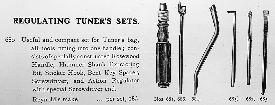 Between the turn of the twentieth century and 1910, all the major piano suppliers offered their own version of interchangeable combination handles for action regulating tools. The American Felt Co. drawing of their Adjustable Tool Handle was retained for the subsequent American Piano Supply (A.P.S.) Catalogue from the mid-1920s.
