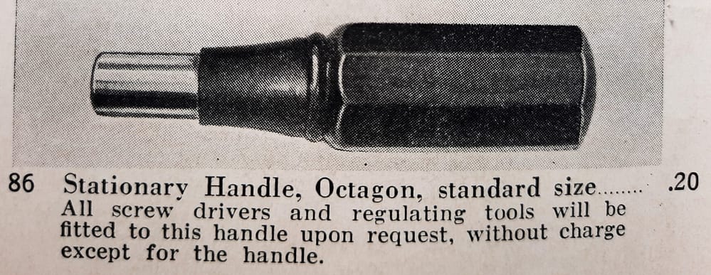 L. & H.Combination Handle, Version 2, 1916 Catalogue. The proprietary L&H tools have a square base which were designed to work with this particular handle only. To release, you depress a tab on the back of the handle by tapping down on a hard surface. It works well (as long as one doesn’t do this on the piano cabinet!). Circa WWI era.