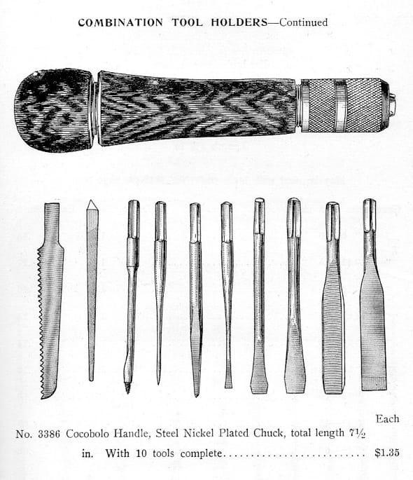 Miller Falls handle in the 1911 American Felt piano catalog: disassembled, showing chuck and tools contained in hollow handle.