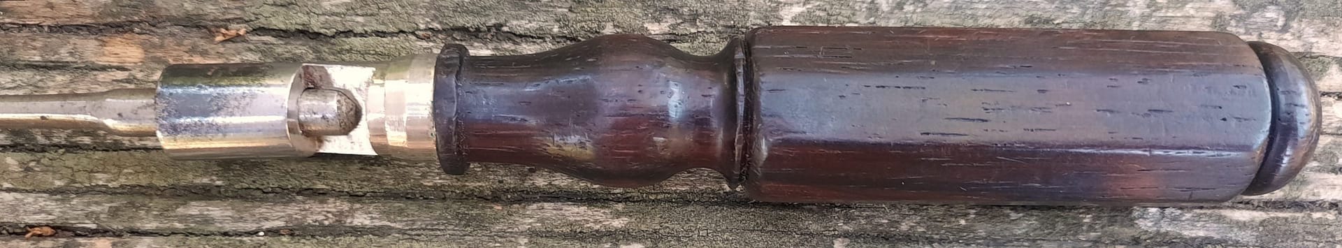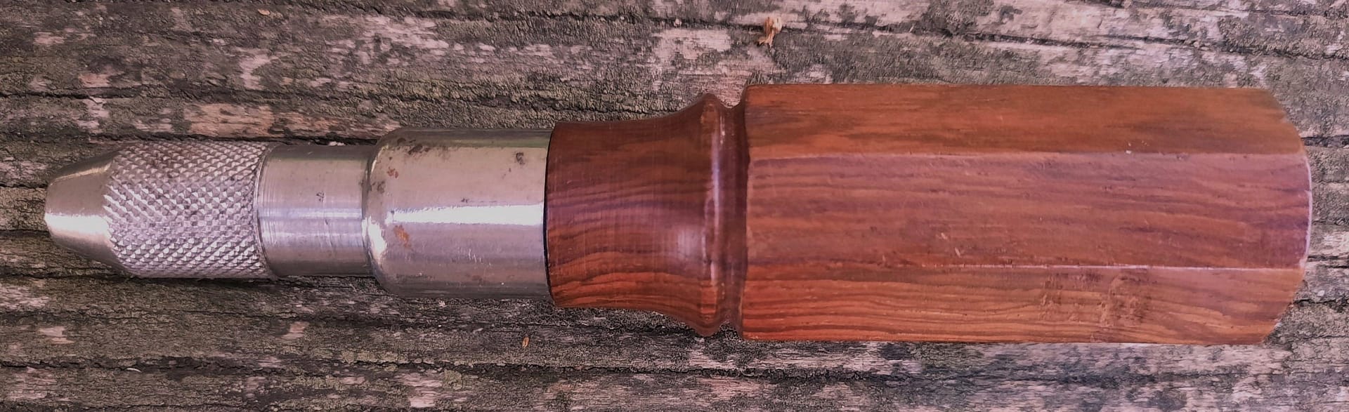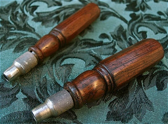 Original Hale “Friction Grip” handles, in mahogany, with No. 25 German Silver center pin as locking bar for the inserted tool. I purchased these new from Hale in the 1970s. The Hale drop regulator is 3 1/2″ long.