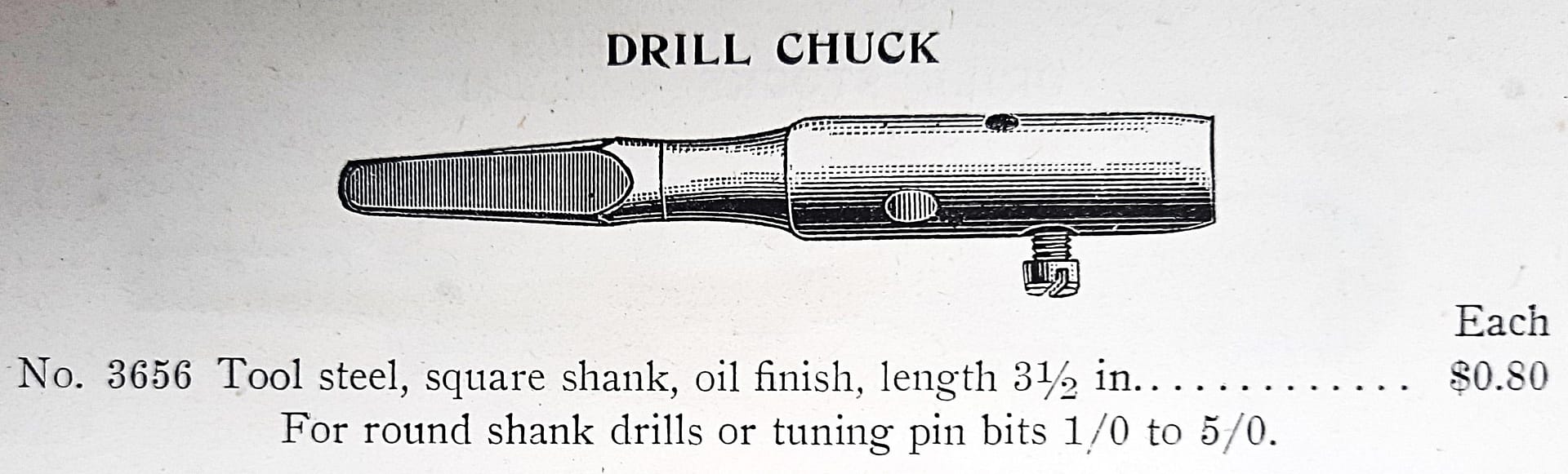 A drill chuck similar to the modified drill chuck fit in the above handle. Same handle with Lang damper wire bender attached. A.F. catalogue, c.1911.