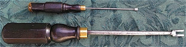 Adjustable handles for piano regulating tools became popular for the mobile piano technician relatively soon after their introduction around 1900. Since a good number of regulating tools were made to be compatible with it, including screwdriver blades with sizes up to 5/16″ for general driving, these handles were used constantly. In order to accommodate the different functions of all these tools, Frank Hale at Tuners Supply in Boston offered their combination handles in small, medium, and large sizes. As far as I know, there is no current supplier who offers three sizes, and Hale was not known for having a selection of tools as large as Hammacher Schlemmer or American Felt Co.