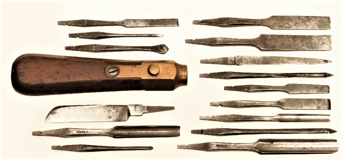 Lyon & Healy combination set (version 2), handle made of ebonite, fairly similar to C. H. Lang’s before it. These proprietary L.&H. tools have a square base which were designed to work with this particular handle only..