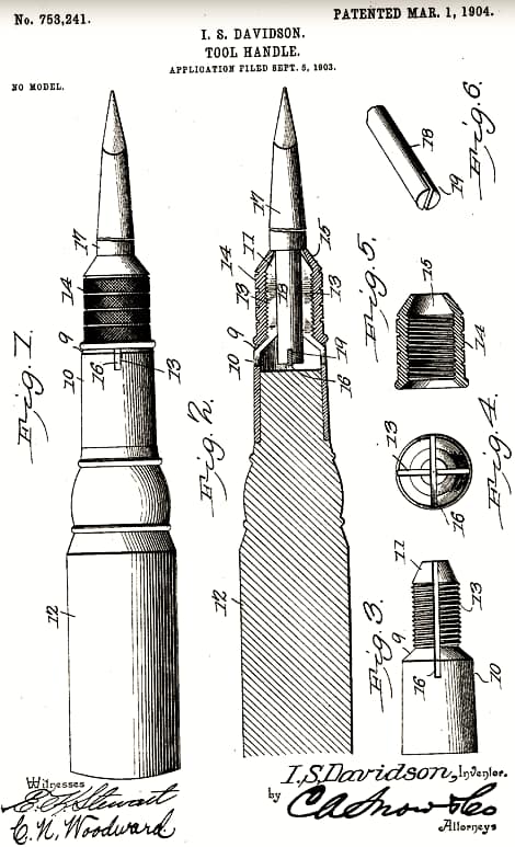 L.S. Davidson’s combination handle was the earliest US tool handle patent—with a reference to piano work—that I’ve found. Here is some of the text for the 1904 tool handle patent: