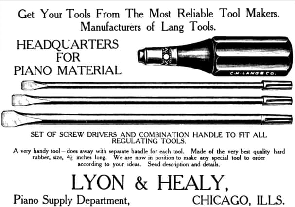 Lang’s policy of exclusively selling piano tools was changed immediately. Lyon & Healy promptly added piano materials, hardware, and parts for their line of piano supply merchandise.