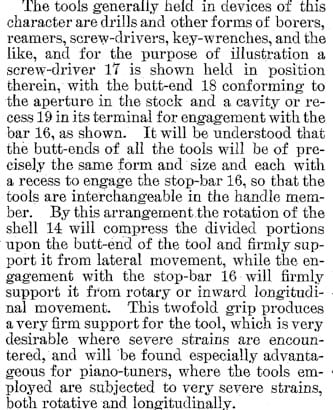 A difference between the Miller Falls type of tool handle and the patented handle shown below is that lateral and longitudinal movements of the tool are held in check by two separate functions in the tool, in a way not unlike the present piano regulating combination handle. This differs from the older tool handle above, in which both potential movements of the tool bit are controlled by one piece of hardware, the collet, or in this case, the chuck.