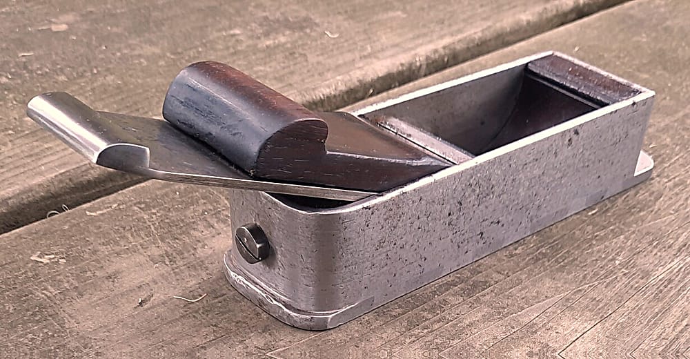 Rather than a lever cap or bridge to hold down the rosewood wedge, there is a raised rectangular lug on each of the sides of the plane to secure it. This method allows the cutting iron to be withdrawn without fouling or catching on the rest of the plane. In fact, due to the ultra tight mouth, it would be impossible to insert or withdraw the iron anyway by using those two aforementioned methods.