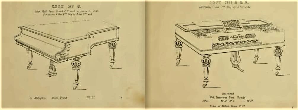Collard & Collard Grand and Square pianos, as shown in their 1840 catalogue. Sometime before 1851, Edward, Sarah and Charlotte left Brighton, and moved to Kentish Town (Saint Pancras), London. John George made a career switch from planemaking to pianomaking and started work at Collard & Collard Piano Company.