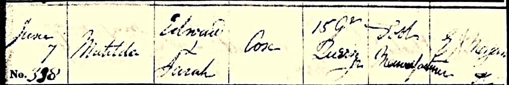 Matilda Cox was baptised at Saint Giles in the Fields, on 7 June, 184 . Edward Cox, “Tool Manufacturer,” was living and working from 1 Great Queen St.