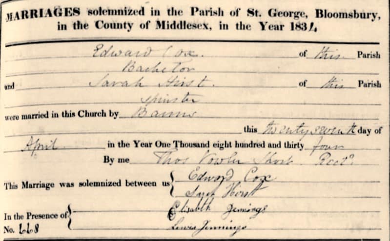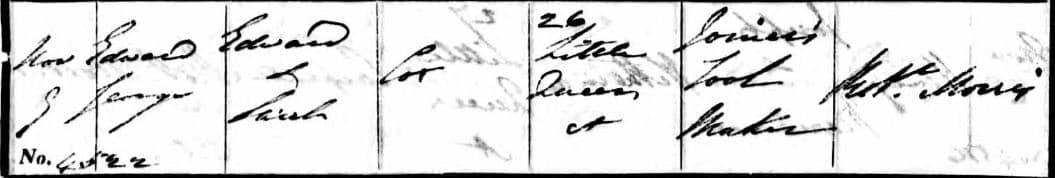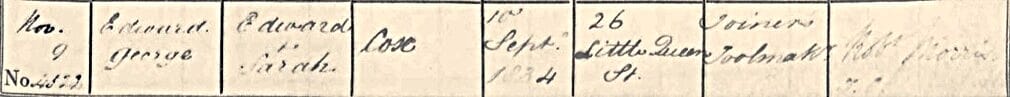 In 1834, Edward and his new wife Sarah Hirst had moved to 26 Little Queen St., just down the block from Ann Moon’s Tool Warehouse. The recurrence of the street number 26 was a coincidence. Edward and Sarah married at Saint George’s Church on 27 April, 1834. St. George is on Bloomsbury Way, about 4 blocks west of Lincoln’s Inn Fields.