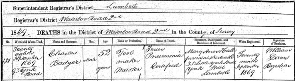 Charles Badger (1817-1869) lived with his wife Isabella at 1 Stangate St. in Lambeth, and reported his occupation as ” Master Tool Maker” for the UK census in 1861.