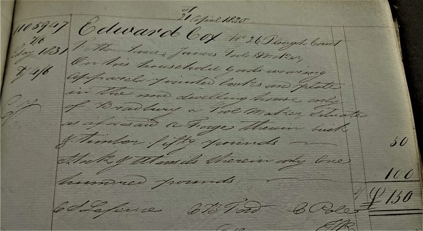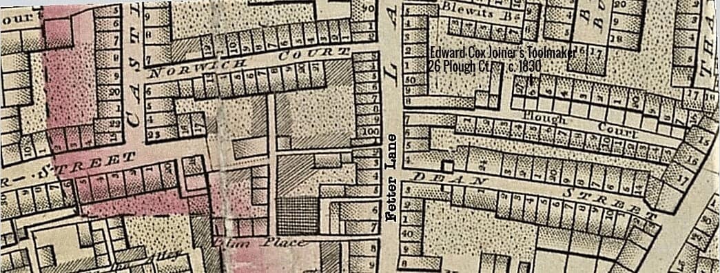 Edward Cox, Joiners’ Toolmaker at 26 Plough Court, Fetter Lane, <1830-1831>. By 1830, 24 year old Edward Cox had established himself as a Joiners’ Toolmaker at 26 Plough Place, Fetter Lane in London. Cox shared these premises with another toolmaker by the name of Bradbury, and they had a forge on site there. Plough Place was about 5 blocks east of Lincoln’s Inn Fields. “Utensils” denoted equipment and tools, not knives and spoons.