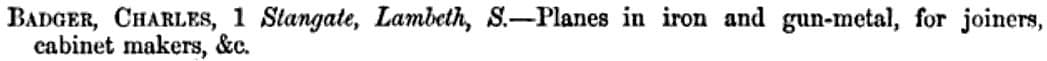 Thomas Williams, wooden planemaker, Robson’s 1840 London City Directory. Williams left 30 Stangate Street in the early 1840s; the proximity to Badger at 27 Stangate was a coincidence. No known connection.