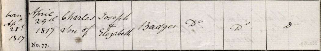 Charles Badger was born 28 April, 1817, in Longborough, Goucestershire, to Joseph and Elizabeth Badger. Birth dates for early British metal planemakers within this website range from 1731 (John Sym) to 1817 (Charles Badger). In chronological order, the next planemaker, Stewart Spiers (1820-1899), had a career which extended into a later period.