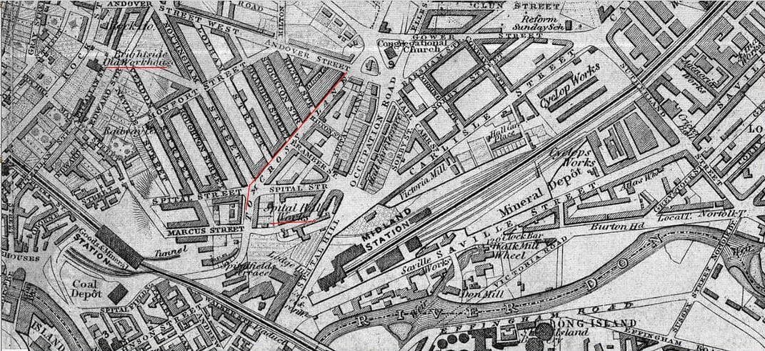 Sheffield Ordnance Survey, 1851, showing Tom Cross Lane, and Spital Hill Works, Sorby Factory. After his bankruptcy, Edward Cox moved to Sheffield. Because of its proximity and prominence, I have pointed out the large “Spital Hill Works” of the Sorby edgetool making dynasty.