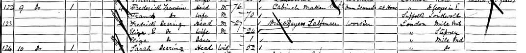Frederick Tremain, Cabinetmaker, 9 Hall St., Mile End, Old Town. 1901 U.K. Census. John Tremain Sr., deceased, had been a “cabinetmaker.”