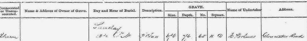 Edward Cox’s burial was done 28 April, 1874 in Burngreave Cemetery in Sheffield. “Cons.” is an abbreviation for the grave having been consecrated. Henry Taylor performed the ceremony.