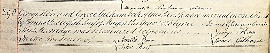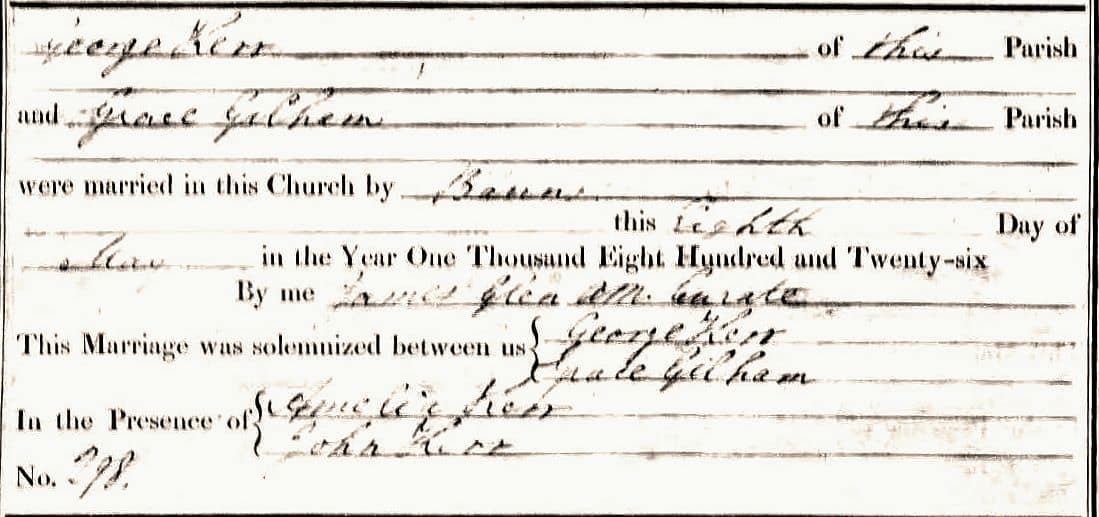 Secondary document: George Kerr married Grace Gilham, at Saint George, Hanover Square, on 8 March, 1826.
